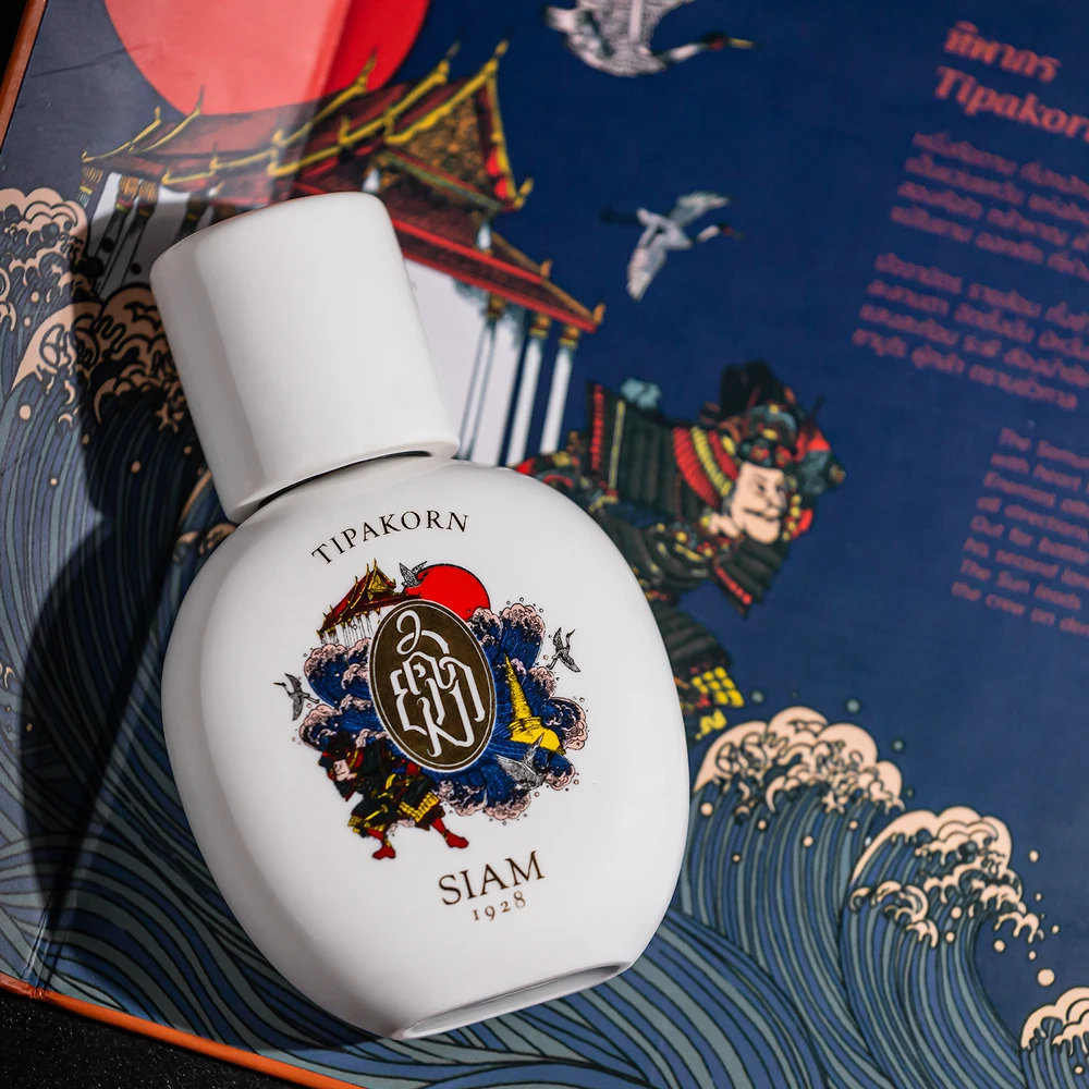 Tipakorn by SIAM 1928 is an olfactive fragrance for men and women. Launched in 2020, this composition features the olfactory signature of Nutt Wesshasartar. The top notes unfold with borneol, yuzu, Strobilanthes callosus, and bergamot; the heart reveals tobacco, matcha tea, and smoke; while the base notes settle on vetiver, oud wood, and patchouli.